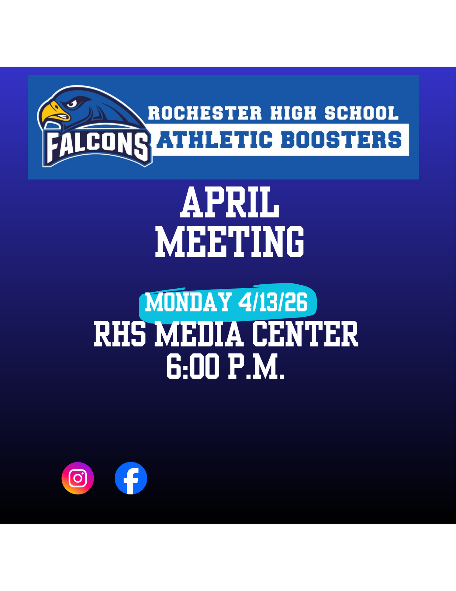 All meetings take place in the Rochester High School media center and are open to anyone. Voting on important issues is only available to current school year members. See tab above for joining the booster club for the current school year.